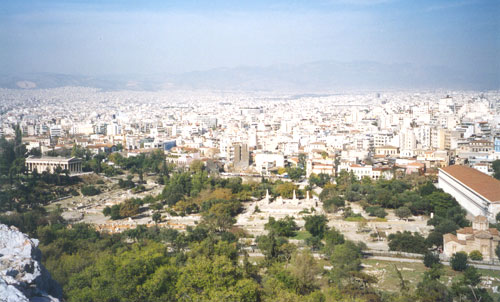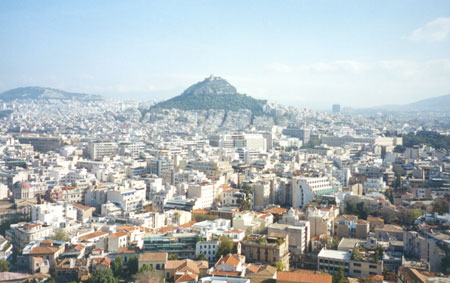 Μερική άποψη της σημερινής Αθήνας από το όρος Αιγάλεω (στο βάθος διακρίνεται η Ακρόπολη και ο Λυκαβηττός)